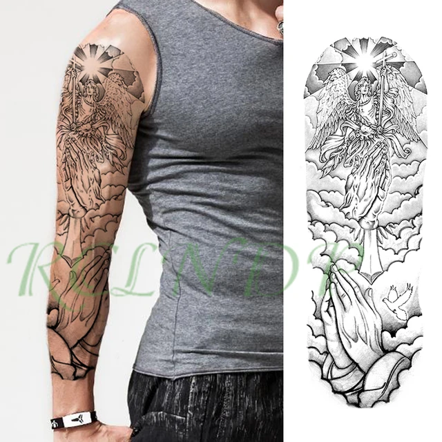 大型アームスリーブタトゥー時計ハロークロス防水一時的なタトゥーステッカー平和鳩ローズ